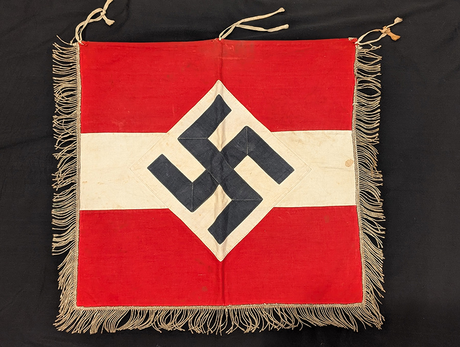 2511F1 - Hitler Youth trumpet banner. This double-sided cotton banner presents a multi-piece constructed central Hitler Youth diamond emblem. The horizontal white stripes show mild age wear. The banner is bordered with gold fringe that is fully intact. All three tie strings are intact. A great display banner suitable for framing. 1495. More Photos |