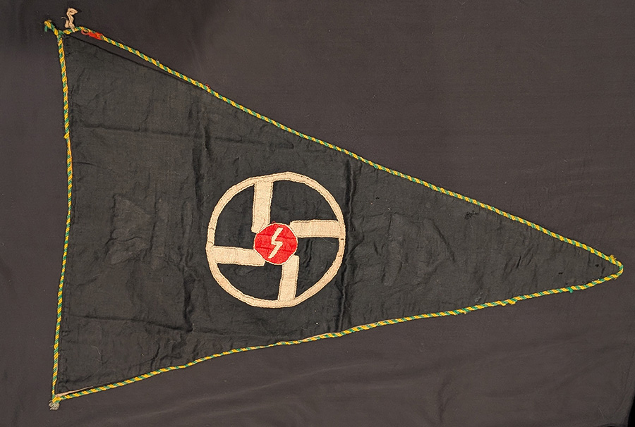 249SO2 - Jungmadel UNTERGAU #615 pennant. This perfect triangular pennant measures 52.0 x 9.0 inches. The pennant features the stylized black eagle with magnificent hand-embroidery highlighting the eagle's feathers. The Untergau 615 unit is detailed with the same hand embroidery The black cotton field is free of any tears and stains. All four of the retaining clips are present on the hoist side. 3400 More Photos |