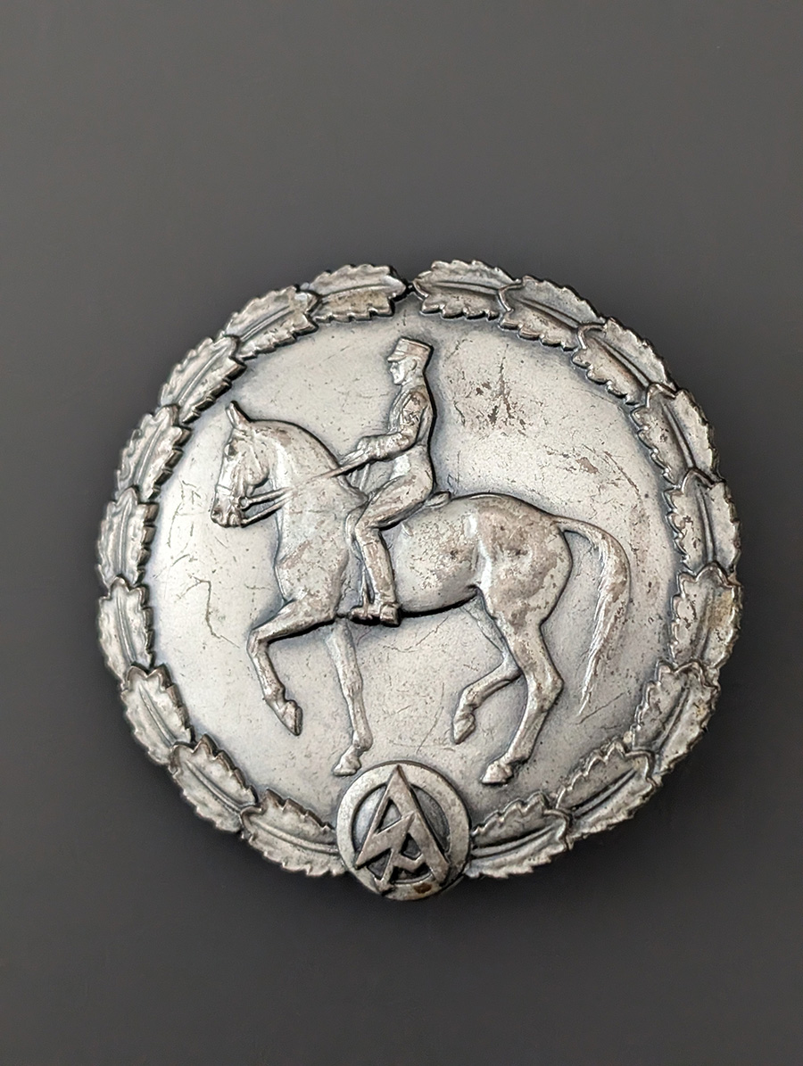 148MAB48 - German Horseman's ( Reiterabzeichen) badge in bronze. Horseback riding compettions were popular in pre-war Germany with ties to military cavalry units and Germany's landed gentry. The SS and Army cavalry units often competed in these competitions. This early example features a wreathed mounted horseman above the letter "R" designating "Reiter". The reverse displays the full "GESETZLICH GESCHUTZT" later abbreviated to Ges. Gesch. The full maker name is present being "L. CHR. LAUER, NURNBERG-BERLIN". $125. More Photos |