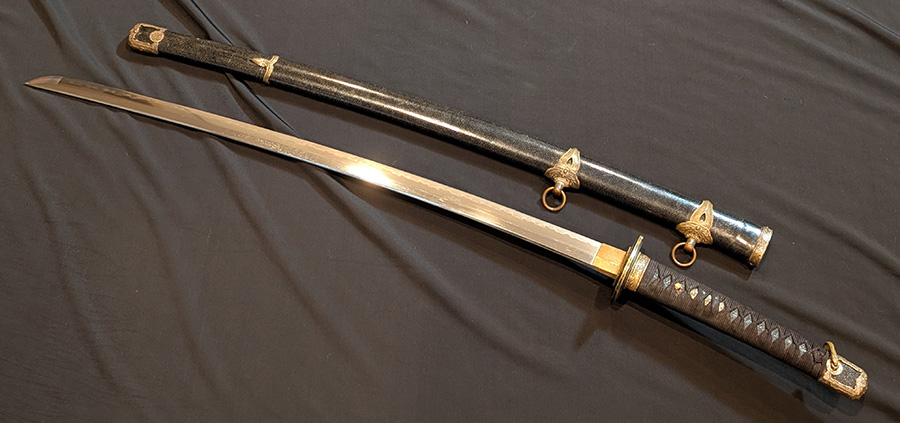 2511SO2 - Japanese Imperial Navy officer Kai-Gunto katana. Japanese Naval officers swords are considerably more- rare than their Army counterparts Shin-Gunto. This katana Showato period hand-made arsenal blade measures 27 inches from the tip to the naval style tsuba. The hamon is the more common wave pattern The tang is nicely marked with the sword's maker. The braided silk wrapped tsuka ( grip) is in perfect condition. Beneath the braided wrap are the three chrysanthemum menuki. Also visible through the wrapping is the same ray skin. Only two seppa were used that separate the space between the hilt and cutting edge blade. The wood scabbard is wrapped with the traditional blue pebbled ray skin wrap. 2600. More Photos |