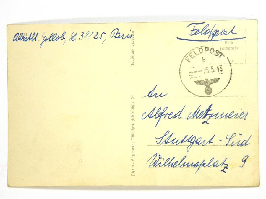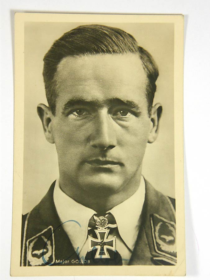 1203PC4 - Luftwaffe General der Jagdflieger Gordon Gollob Diamonds winner. First pilot in history to claim 150 aerial kills. Signed postcard with Paris address 1943- $365