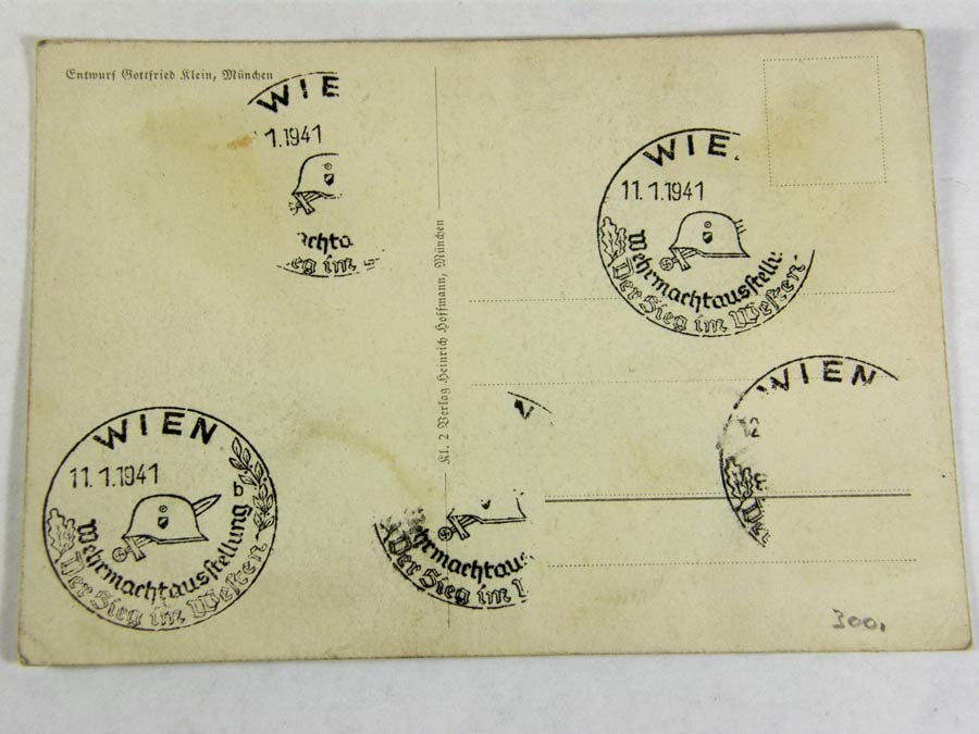 1204PC21 - Gottfried Klein's "Iron Cross 2nd Klasse". This card features the Iron Cross with helmet. The reverse is unmarked. Gottfried Klein was perhaps the most popular postcard artist of the Third Reich era. $165