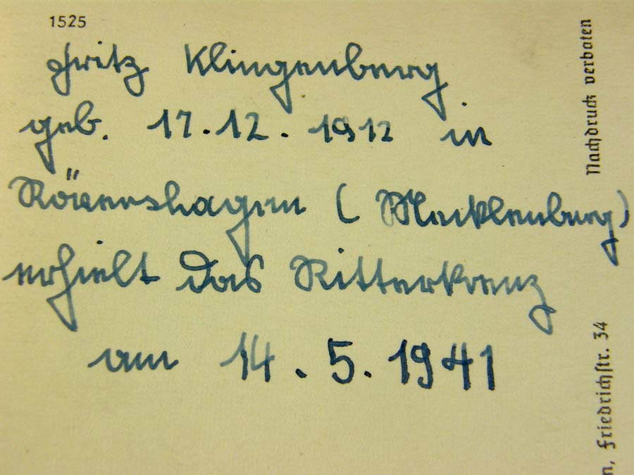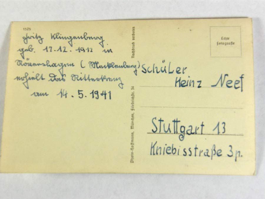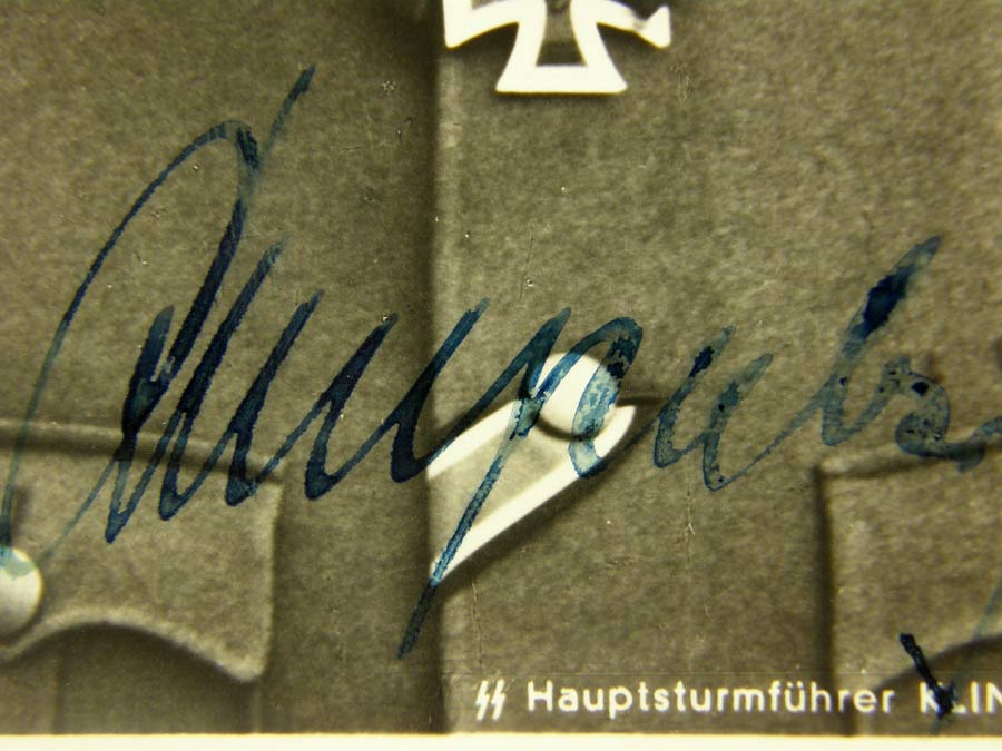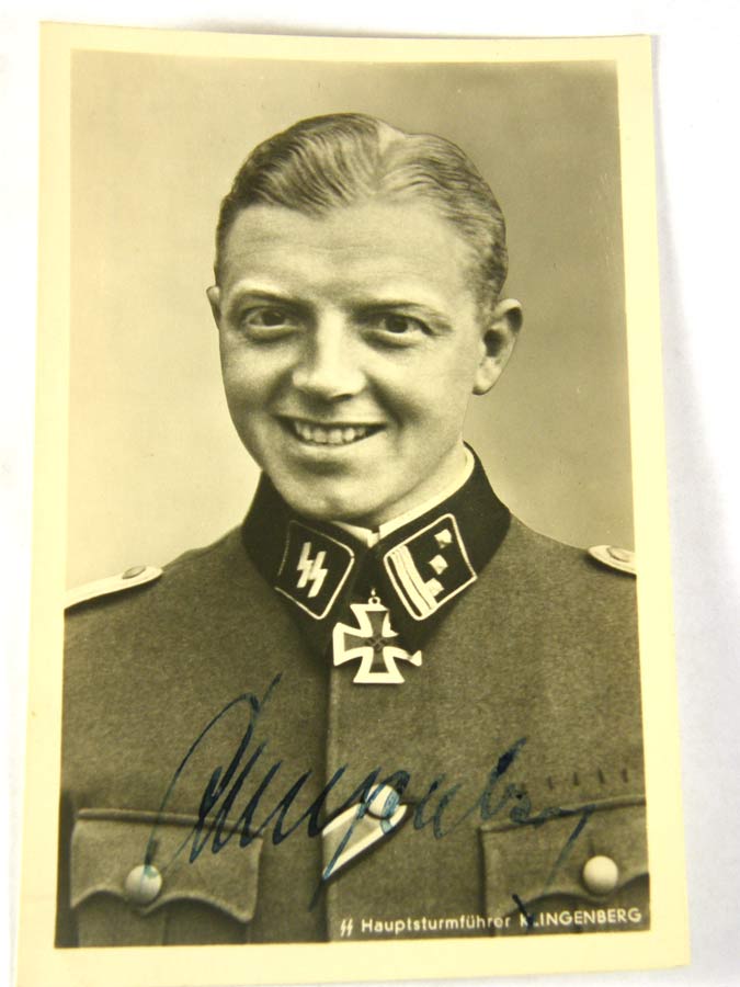 1204PC3 - Waffen SS Ritterkreutztrager Hauptsturmfuhrer Fritz Klingenberg by Heinrich Hoffman. Card features rare Klingenberg autograph. $900