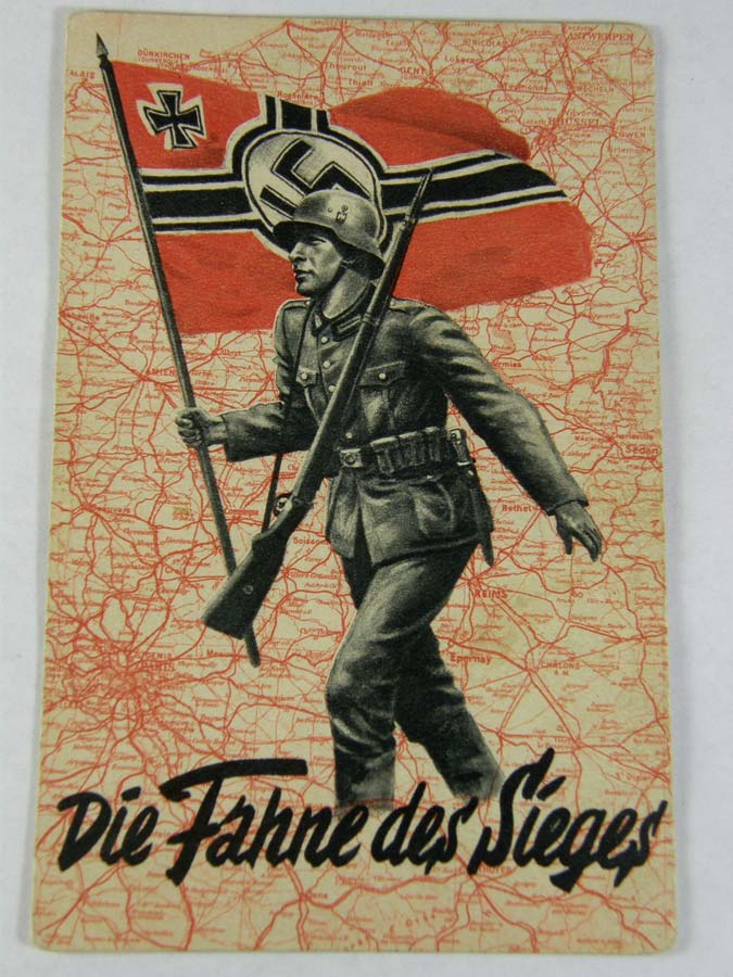 1204PC51 - "Die Fahne des Sieges" ( The Flag of Victory". Heroic image of the German Infantryman moving forward with the flag. $250