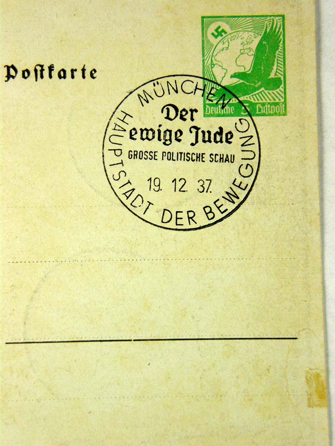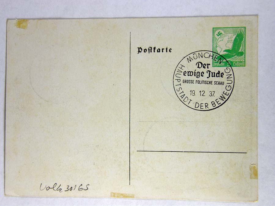 1204PC9 - "The Eternal Jew ". This anti-Semitic card features a highly prejudicial characterization of a Jewish money lender. The Munchen printed card features the money being gold/yellow ink printed. $250