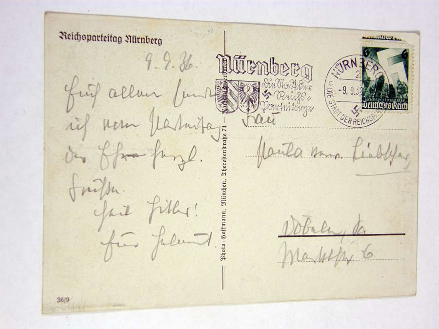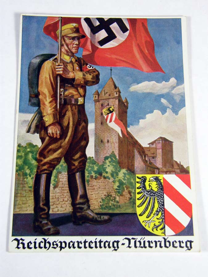 1209PC18 - Reichsparteitag Nurnberg. This card features a SA man with NSDAP flag. Reverse displays postmark. Rare. $230