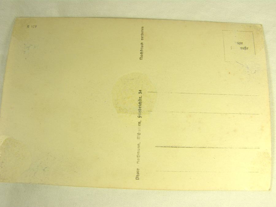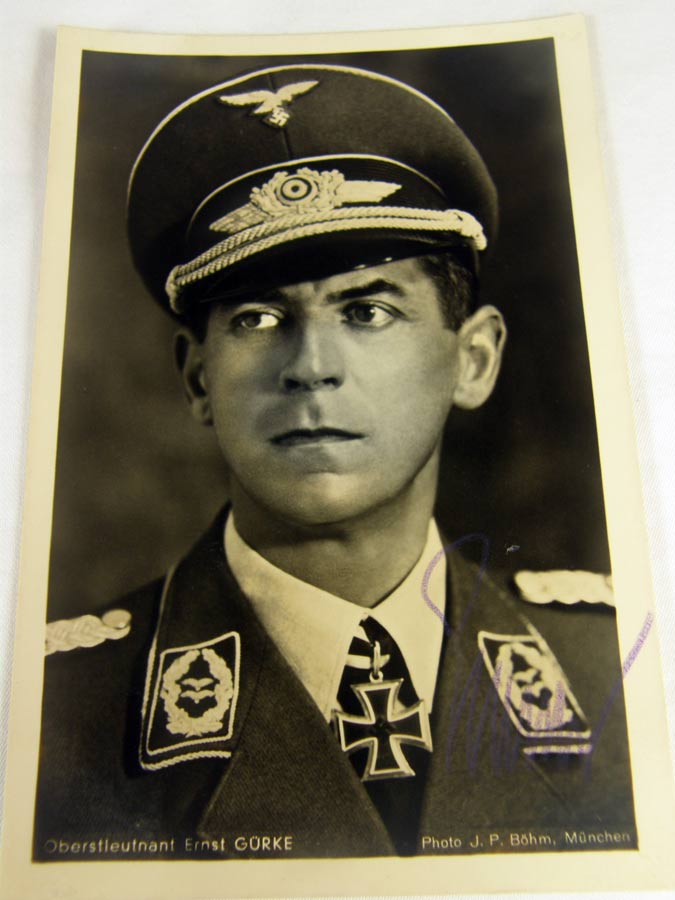 1209PC2 - Autographed Luftwaffe Eichenlaubträger ( Oak Leaves holder ) Oberst Ernst-Friedrich Gurke studio portrait card. Oberst Gurke commanded the 43rd Motorized Flak Rgt. with the Afrika Korps. Died in a Russian POW camp in 1946. Rare. $250