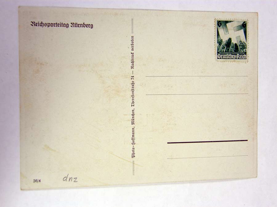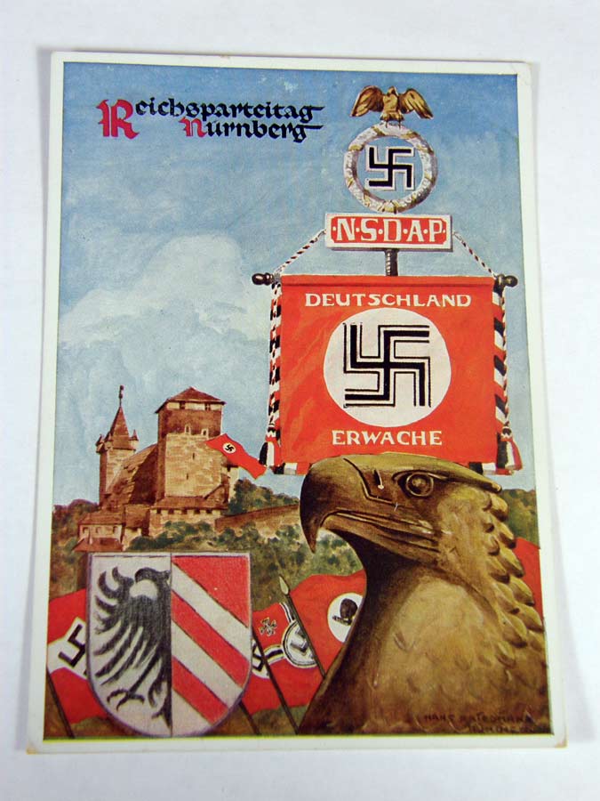 1209PC20 - Reichsparteitag Nurnberg. This card features a NSDAP DEUTSCHLAND ERWACHT standart with an eagle in the foreground. Reverse is stamped. $300