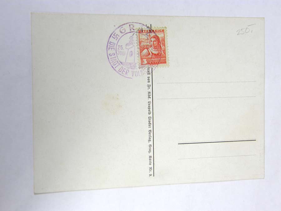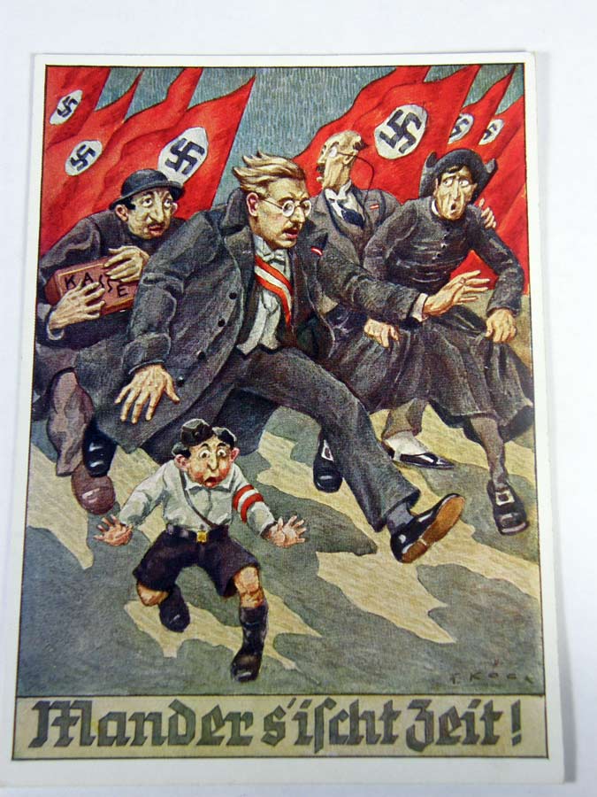 1209PC23 - Manders ischt Zeit! Features Jewish refugees fleeing before the NAZI's. Card was released after the annexation of Austria. Reverse shows postmark. $250