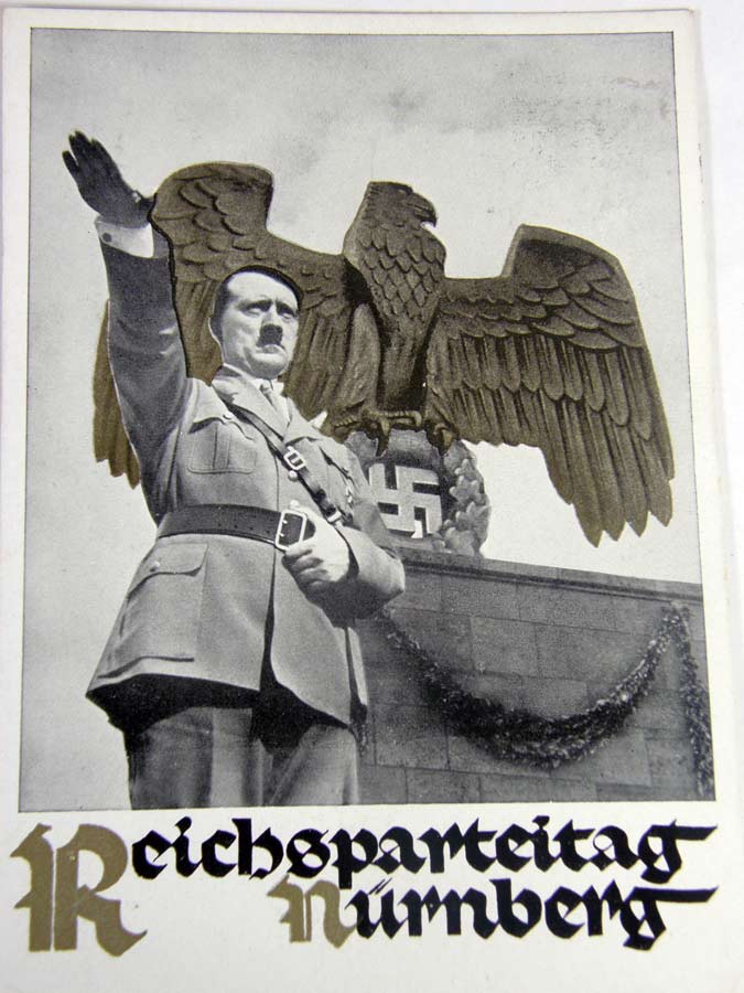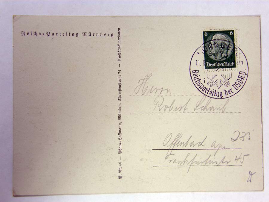 1209PC28 - Reichsparteitag Nurnberg. Hitler before the state eagle at Nurnberg. Gilt eagle and lettering. Reverse is addressed and postmarked. $250