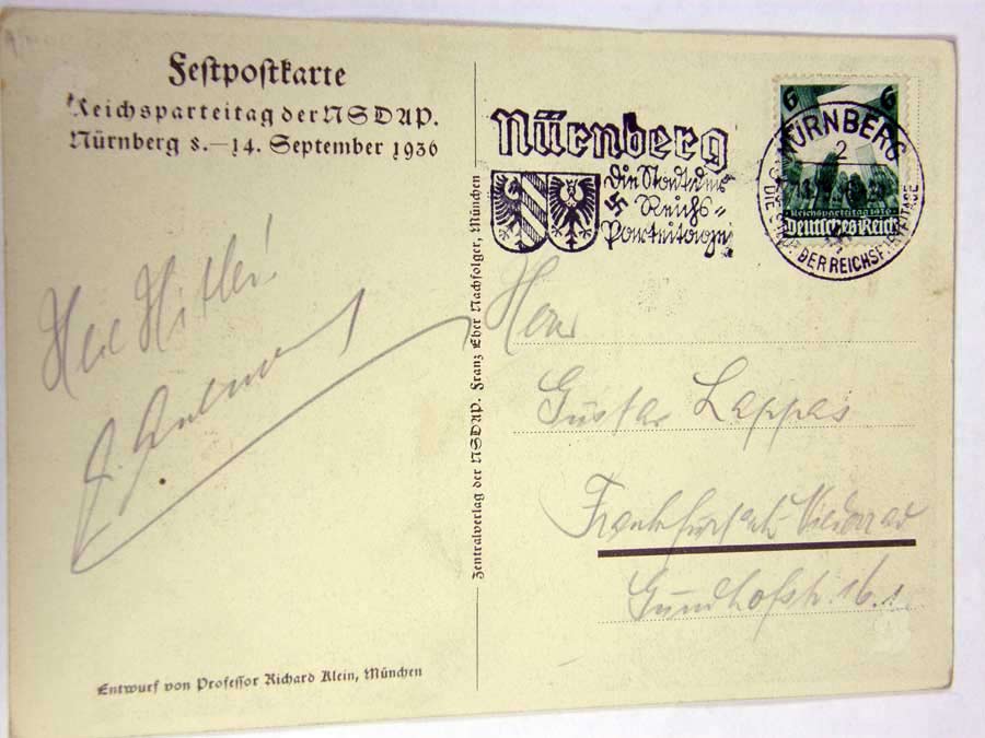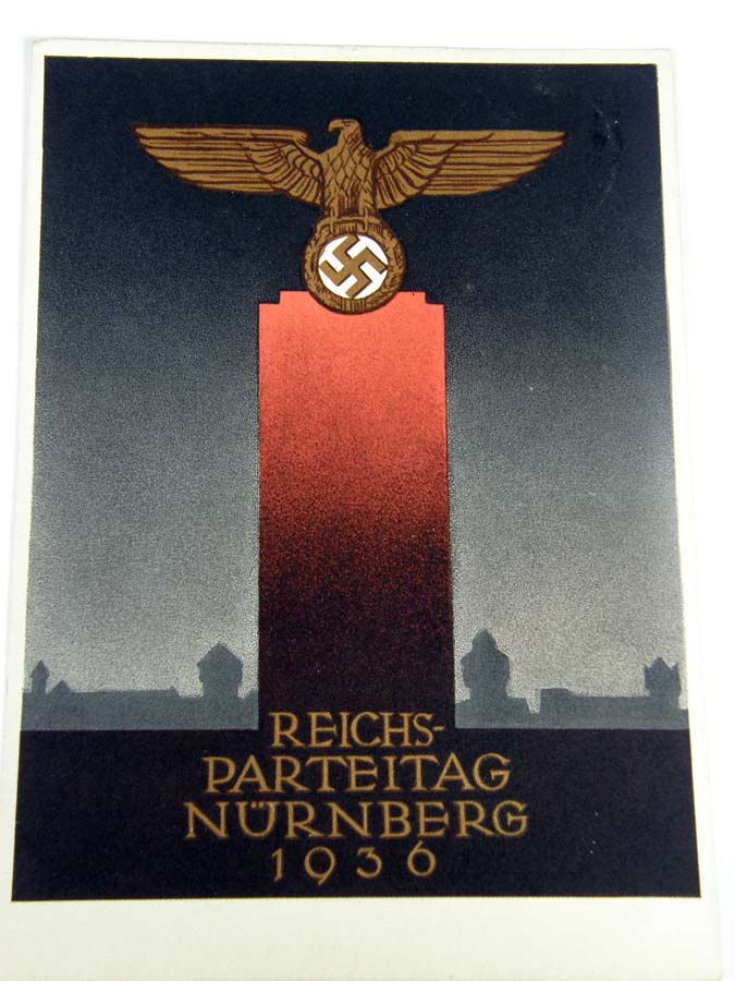 1209PC31 - Reichsparteitag Nurnberg 1936. This card features a NSDAP eagle on a pedestal. Reverse displays postmark and personal note.$150