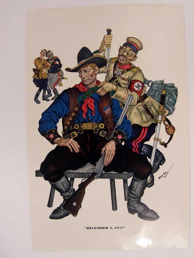 DECEMBER 7,1941 showing a Japanese soldier stabbing an unsuspecting American cowpoke in the back