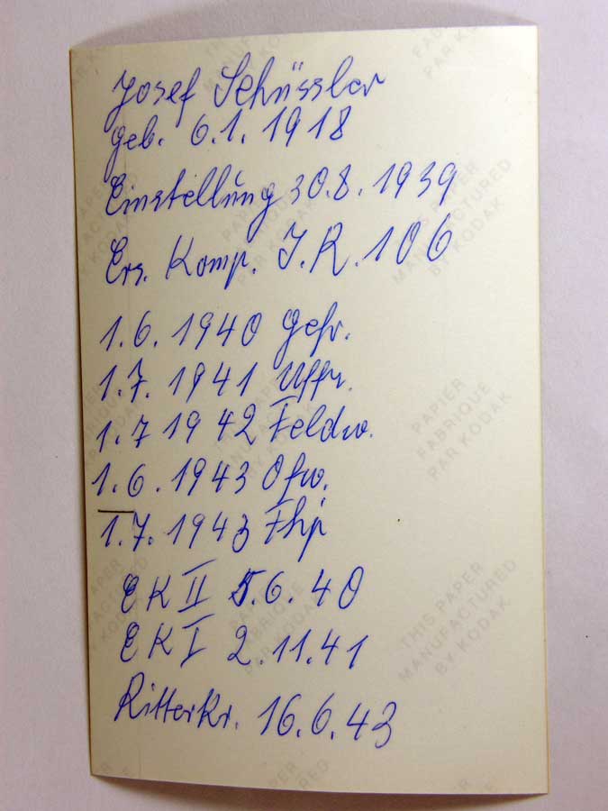 131PC7- POST-WAR SIGNED KNIGHTS CROSS WINNER, FHJ JOSEF SCHUSSLER $32