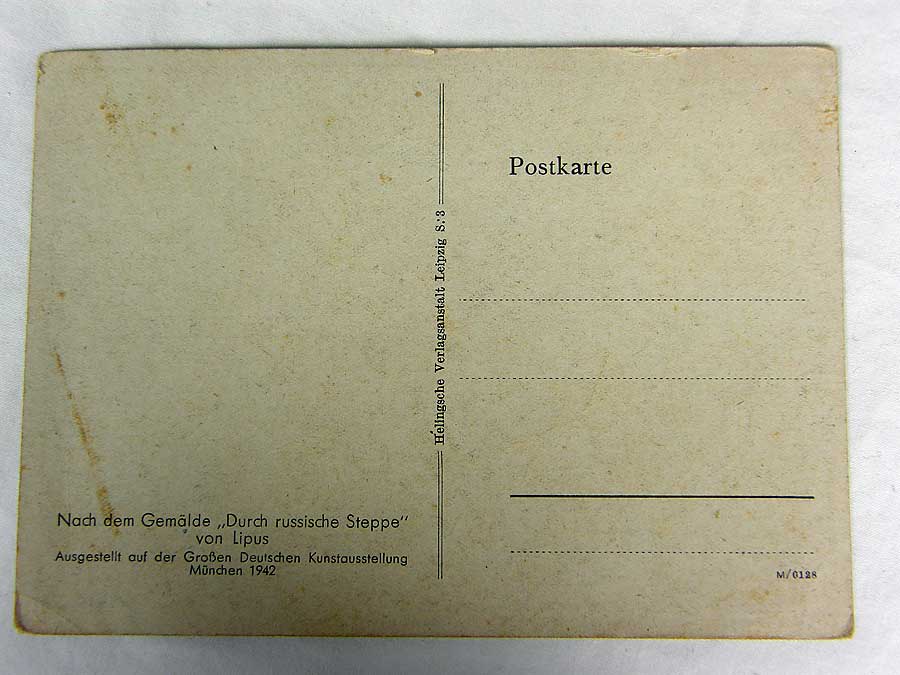 134PC1 - German Army art postcard Nach dem Gemalde " Durch russische Steppe" by von Lipus. Depicts German troops wearing zeltbanns on the Ruusian Steppe. Creased. $65