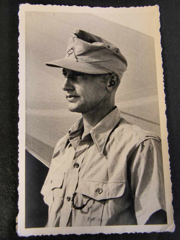 Deutsches Afrika Korps postcard featuring photograph of Luftwaffe man wearing an Army M41 tropical field cap converted to Luftwaffe with eagle and wearing triangular embroidered eagle on his tropical issue shirt. $25