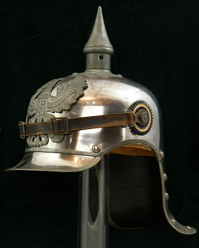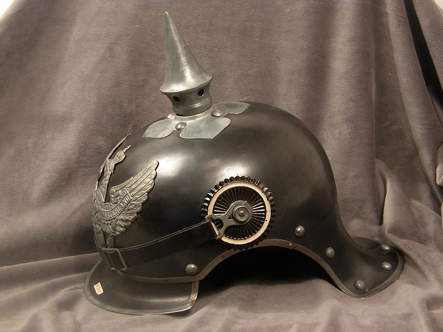 143IHEL1 - Prussian Jager zu pferde enlisted "lobster tai" spiked helmet. This helmet features a gun metal gray finish to its steel body. The spike is attached to a cloverleaf design enlisted base plate. The wappenshield front plate is zinc and features the Imperial Prussian eagle. The side rosettes, one indicating the state colors of Prussia, attach the black leather chinstrap. The lobster tail neck shield shows a "pointed" mid-point indicating Jager zu pferde use. The interior features an enlisted style leather liner. There is a name plate affixed with miniscule screws that displays the maker's name "Herm. Weissenburger & Co., ..." The front visor and rear neck lobster tail are trimmed with zink. The rear neck shield has the size "61" stamped in to the metal. This helmet was acquired after being decommissioned by a museum and retains its museum inventory tag on the front visor. helmet . Excellent example. $2400. More Photos |