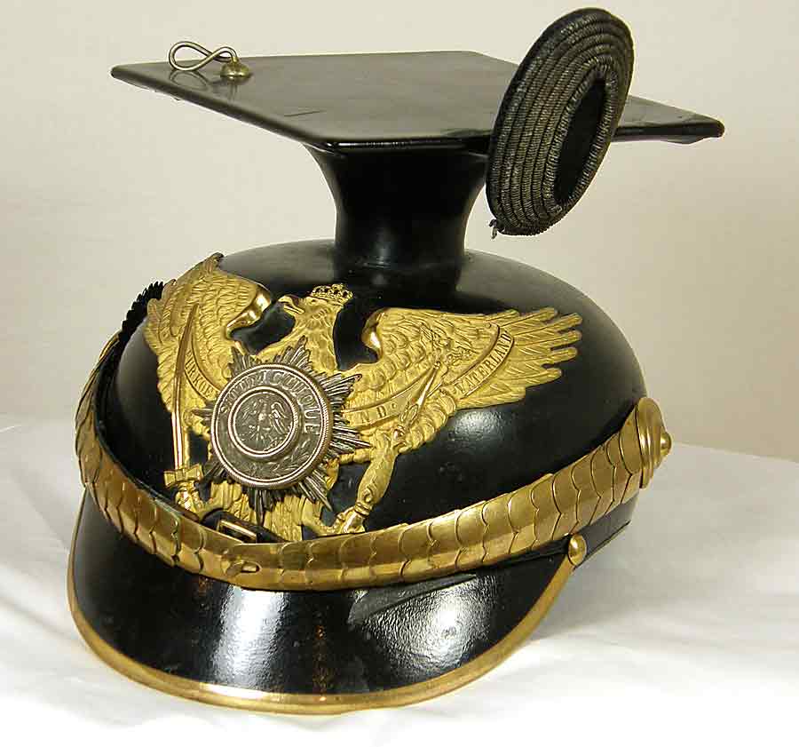 113H7 - Imperial Prussian Stelldertretter ( acting officer) Tschapka of the 2nd Garde Ulan Rgt. This rare tschapka features the large gilt Prussian state eagle wappen with a non-enameled Garde Star indicating an acting officer. The Prussian Garde regiment motto 'Suum Cuiqui' is on the central Garde Star along with the Prussian eagle that is affixed to the larger gilt wappen. The black leather body is in excellent plus condition with leather shell having no serious distractions or repairs. The officer's gilt chinscales match the gilt of the wappen and are attached to the tschapka's body with the Prussian kokarde on the right side. The top morter board is in excellent condition and the attached officer's bullion kokarde is of a larger size and higher quality. The leather visor is bordered with a gilt edge that matches the chinscales and wappen. The interior displays a complete officer quality leather sweatband that is in near mint condition. A silk officer's "clamshell' liner opens to reveal the size 57 ½. There are no additional holes that would indicate that the wappen or attaching hardware has been tampered with. The 2nd Prussian Garde Regiment served on the eastern front and few of these have been made available. $7500. More Photos |