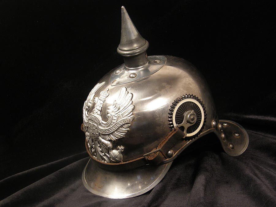102H3 - Prussian Cuirassier (mounted jagers) enlisted helmet. This lobstertail helmet worn by mounted heavy and light Prussian cavalry was first introduced in 1915. The silver plated iron helmet features a large Prussian frontplate (wappen) with the zinc Prussian eagle. The enlisted style leather chinstrap is secured to each side by a rosette plate with a kokarde with the German national colors on one side and the state colored black and white kokarde indicating Prussia on the other. At the top appears a tall zinc vented non-removable spike that is secured to an enlisted style baseplate. The front visor is trimmed with silvered zinc. The highly stylized lobstertail neck guard is composed of three silvered iron scales that extend downward from the rear of the helmet. The underside of the lobstertail is laminated and in excellent condition. The interior features a light brown supple leather lining that opens at the crown revealing the ventilation hole and attaching bolt hardware for the spike baseplate. The maker's stamp is clearly visible revealing the name "Lachmann Berlin" and the date "16". The helmet's size approximately 55. All the interior bolts are present and original to the helmet.. There are no dents or dells. The helmet is in overall excellent plus condition. $2250. More Photos |