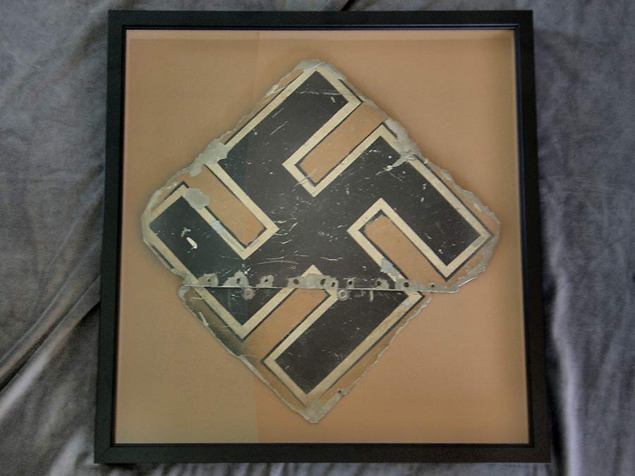 1410SO1 - Very rare Luftwaffe tail section from ME109 with tropical camouflage finish. This rare section of a ME109 features the canted swastika on a tropical tan camouflage background. Having its original tropical camouflage makes this a highly desirable addition to any Luftwaffe or Deutsches Afrika Korps collection. The material is light weight aluminum. The cut-out swastika section measures approximately 13.5 x 13.5 inches on a tan background. It is easy to imagine this rare item in flight over the north African desert or the Mediterranean. Professionally framed. $4,000. More Photos |