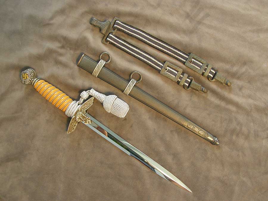 147SO10 - Mint Luftwaffe officer 2nd pattern dagger with portepee by SMF. This stunning example is intended for the discriminating collector who wants mint. This dagger features gilded swastikas on the pommel. Each of the swastikas retain 100% of its gold finish. The yellow celluloid grip is tightly wrapped with twistcord aluminum wire. A Luftwaffe officer portepee is tied around the grip. The aluminum of the ball, interwoven slide and cord is 100% perfect. The lower crossguard shows a deeply cast Luftwaffe eagle displaying excellent detail. The reverse of the crossguard features a deeply pebbled design with a darkened background. The blade is stone mint. The reverse ricasso displays the SMF seated king maker's mark. Above the SMF mark is a Luftwaffe waffenamt " eagle 5 ". The mirror finish full length blade is mint un-issued perfect. The scabbard retains its lacquered finish. The pebbled and oak leaf design surfaces are darkened to highlight the silvered suspension band that display a repeating oak leaves design. accompanying the dagger is a deluxe set of Luftwaffe officer hangers. The Luftwaffe blue cloth straps display two rows of multi-strands of silver aluminum thread. The two rectangular buckles feature the repeating oak leaves pattern. The reverse of the belt clip is marked in raised characters, " D.R.G.M. , E.U. 10 and RZM ( enclosed circle)". Each of the dagger suspension clip, als o with the oak leaf pattern, is marked with D.R.G.M. on the reverse. An incomparable set. $1699. More Photos |