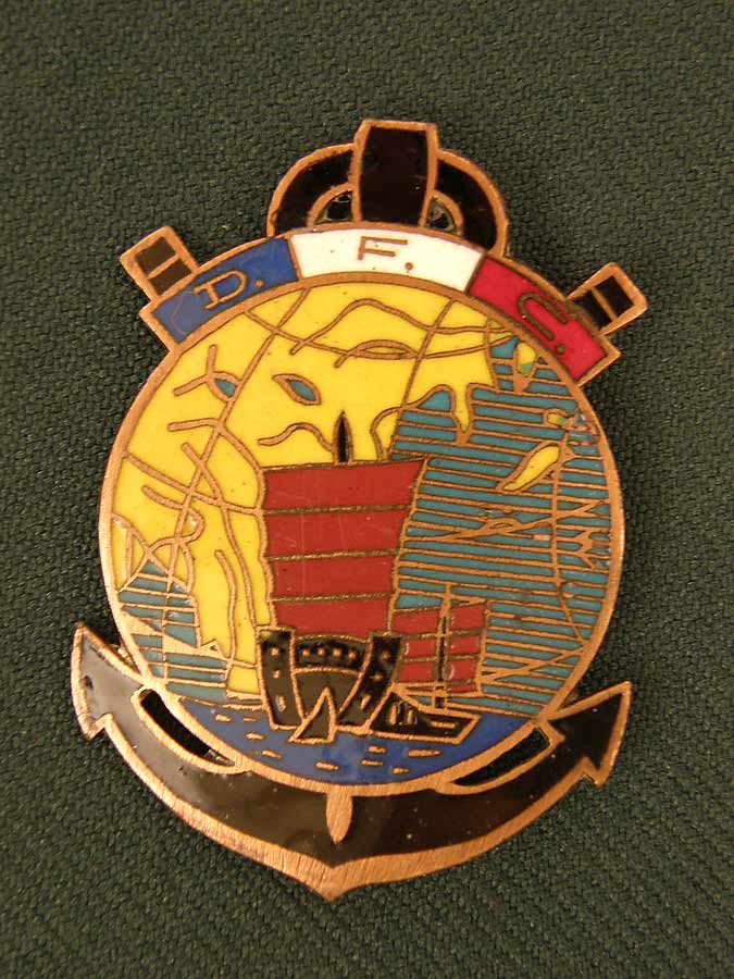 1203FFL3 - Ultra rare badge of the French detachment in Shanghai 1927 -1932 and 1935-1946. Very rare large size version ( 51x37mm). Depicts a Chinese junk before a map of China. Made of brass and enamel with the gilt letters "DFC' ( Detachment Francaise de Changhai ) superimposed over a black anchor. Rare pre-World War II badge for China service. $1100. More Photos |