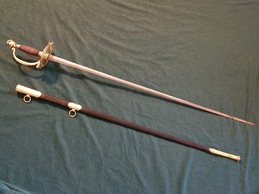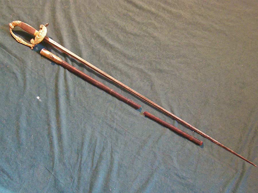 174FREW6 - 54th Regt. of the Line officer's epee, circa 1810, Napoleon head on the counter guard. The 54th Regiment was unique in using Napoleon's head in profile on the guard. Traces of floral engraving on blade. 38 inches overall. Gilt metal scabbard piece remaining on part of damaged leather scabbard. A new leather scabbard could be made using this original metal piece. $2500. More Photos |