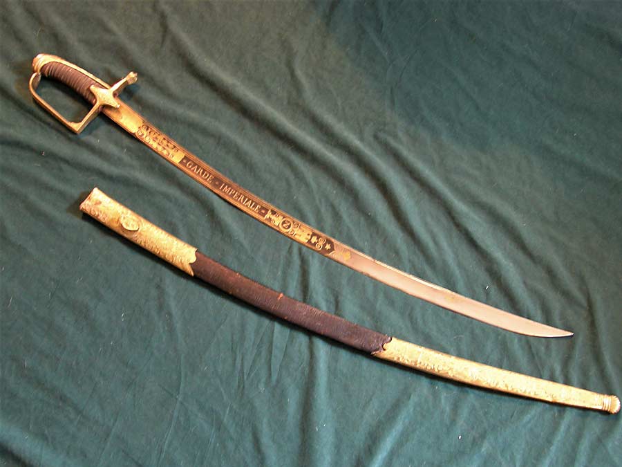 174FREW4 - French Imperial Guard Chasseur a Pied senior officer's sword, circa 1812, made by Duc. 90% of original blue and gilt remaining on the blade. With leather scabbard and finely engraved gilt metal fittings. A rare and special sword. Formally in the collection of Christopher Ross, New York. 36 inches overall. Very fine condition. $17,000. More Photos |