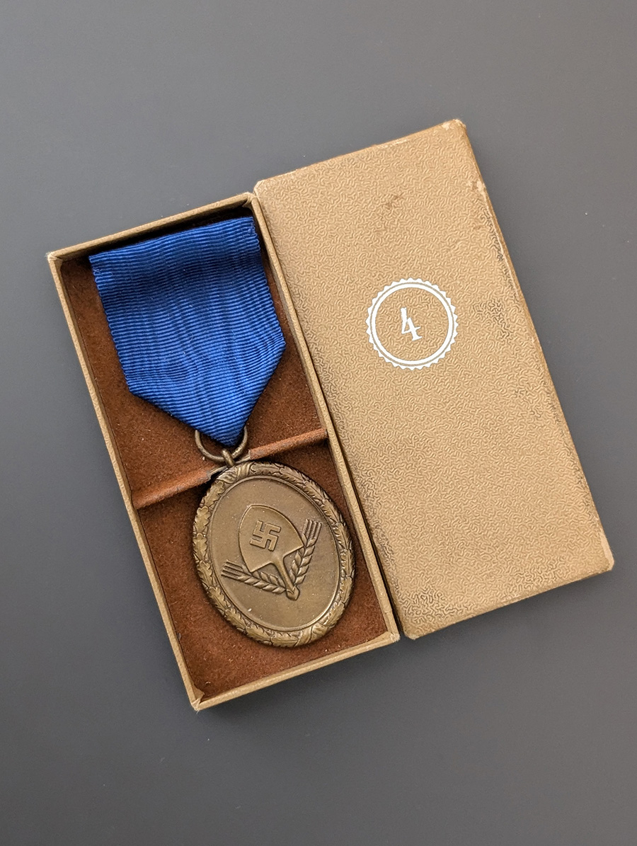 2209MAB23 - NSDAP 10 Years Long Service membership award. This award features its original presentation box displaying a gold party eagle. The un-issued award with ribbon is mint. The underside of the box is stamped with the maker M1/143. $550. More Photos |