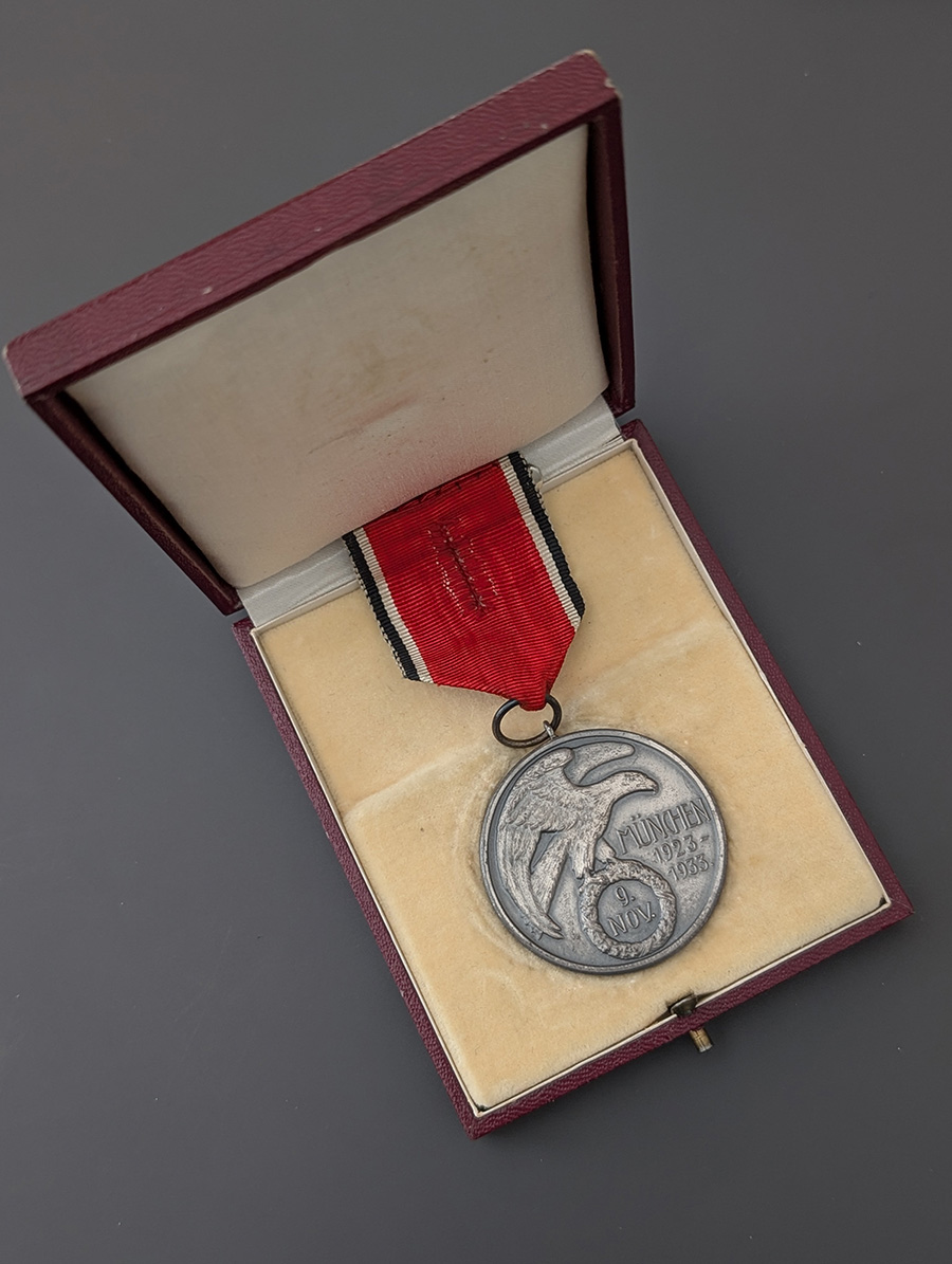 261SO1 - Ehrenzeichen vom 8/9 November 1923 Blood Order. To commemorate the eventful march of November 9, 1923 the NSDAP awarded the Blood Order to the party members who participated in the historic march that resulted in the death of 14 party members and police. Known as the "Beerhall Putsch" the fallen were celebrated as "blood martyrs". The attempted overthrow of the Weimar Republic resulted in the arrest of Adolf Hitler who during his incarceration in Landsberg prison wrote his widely distributed book, "Mein Kampf". The initial strike of the award numbered 1550 followed by a second strike. These were awarded to favored party members and held in the highest regard. This mint award is numbered "2194" and is struck in 800 fine silver. The obverse features a stylized eagle clutching a wreathed dated of "9. Nov." and to the side Mucchen 1923-1933 the year Adolf Hitler became Chancellor. The reverse displays the famed Feldherrenhalle honoring the sacrifices of the German military in previous wars. Below the Feldherrenhalle is the award's number 2194 and the silver content 800. Accompaning the award is the burgundy leatherette case with the date 8./9. November 1923 imprinted in gold. 17,000. More Photos |