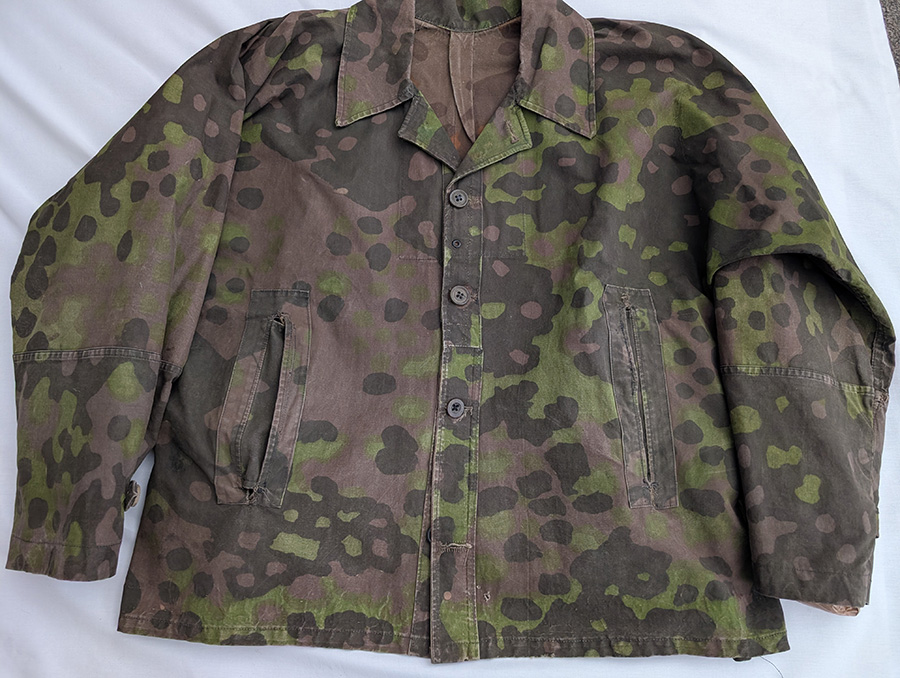 261U1 - Waffen SS 1st model Plain tree camouflage smock converted to combat field jacket. This coat originally was manufactured as a smock as evidenced by the front lace-up grommets that are seen between the buttons on the chest and upper neck areas. The two side flap pockets are identical to those seen on the smocks. Above the left pocket is printed a small arabic numeral 3 indicating the design pattern. This arabic numeral appeared only once at the beginning of the roll of camouflage material. On each wrist and on the side along the waistline are added camouflage straps with buttons for adjusting the cuffs and waist for size. The collar has been field added using the same camouflage pattern. The interior displays the Fall side of the smock. It is unmarked. The jacket displays honest period use with minor repairs and minor separations along the seams.$6500. More Photos |