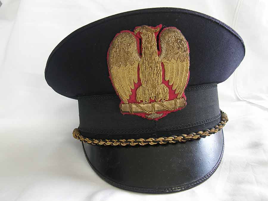 1410ITALH2 - Rare Italian Fascist Party visor hat with white silk top. This hat features a bullion Fascist Party eagle that is backed on burgundy red wool. Burgundy backing denotes the Fascist Foreign Ministry. The white ribbed top is in very good condition having minor age discoloration and staining. The moire silk capband displays interwoven Fascist eagles along the circumference of the band. The bullion chincords are affixed to the capband with gilt Fascist gilt buttons. The interior features the hat maker "V. Lecca, Roma" along with the maker's address. The leather sweatband is complete and the white silk lining appears without wear. There is a thin celluloid sweat shield along the crown that displays minor separations. This rare hat is in overall excellent condition and displays well.$850. More Photos |