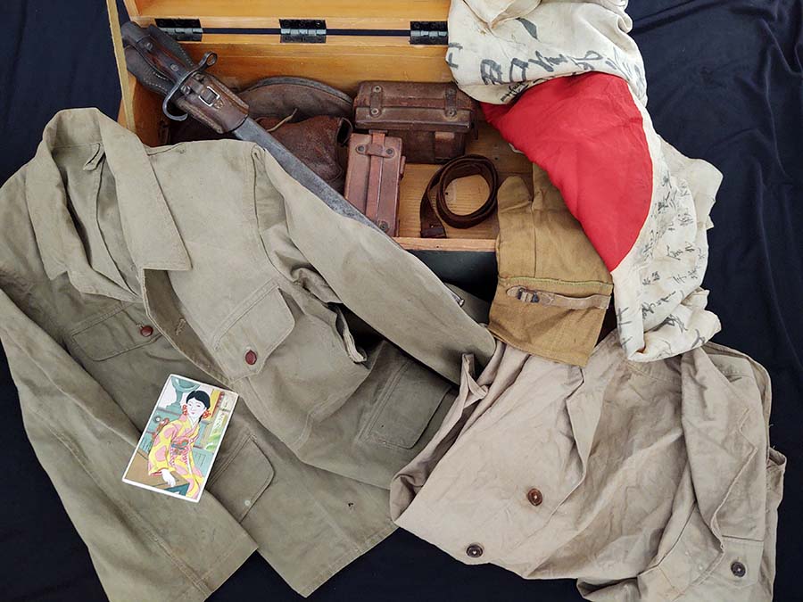 201JAPU1 - Japanese military instruments crate with uniform contents. This large gray rectangular wooden box measures approximately 22.5x11.0 x 9.0 inches. The contents of the crate include: one cotton tunic sans insignia, one cotton shirt, one bayonet,one Japanese flag with kanji, one pair Japanese naval mitts, two leather ammunition pouches, one set of putees, one worn leather belt and one postcard. Rare "bring-back" offering with these contents. $1000. More Photos |