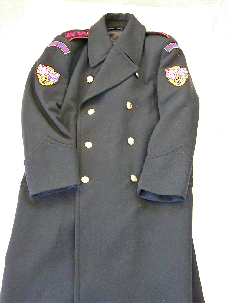 174OCU1 - Czech Palace Guard overcoat. This high quality dark blue wool overcoat features the crest insignia and epaulettes as worn by the Czech Palace Guard at the Prague Castle. The coat features a double breasted set of two rows of of four gilt buttons. The sleeves end in French cuff. On the left upper sleeve is the insignia that shows the three Czech states of Bohemia, Galacia and Moravia. The outside of the coat is in mint condition. The interior displays the maker's label and is lined with artificial silk. The coat size is 46. $600. More Photos |